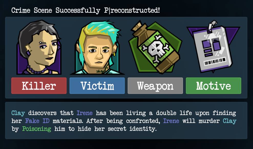 Future Crime my second serious attempt to write a heavily story driven game, but in a wheelhouse I was more comfortable with — crime drama! I also wanted to return to my roots as a puzzle game designer, and I always loved logic-puzzle games like Inspector Parker and Dinner with Moriarty.